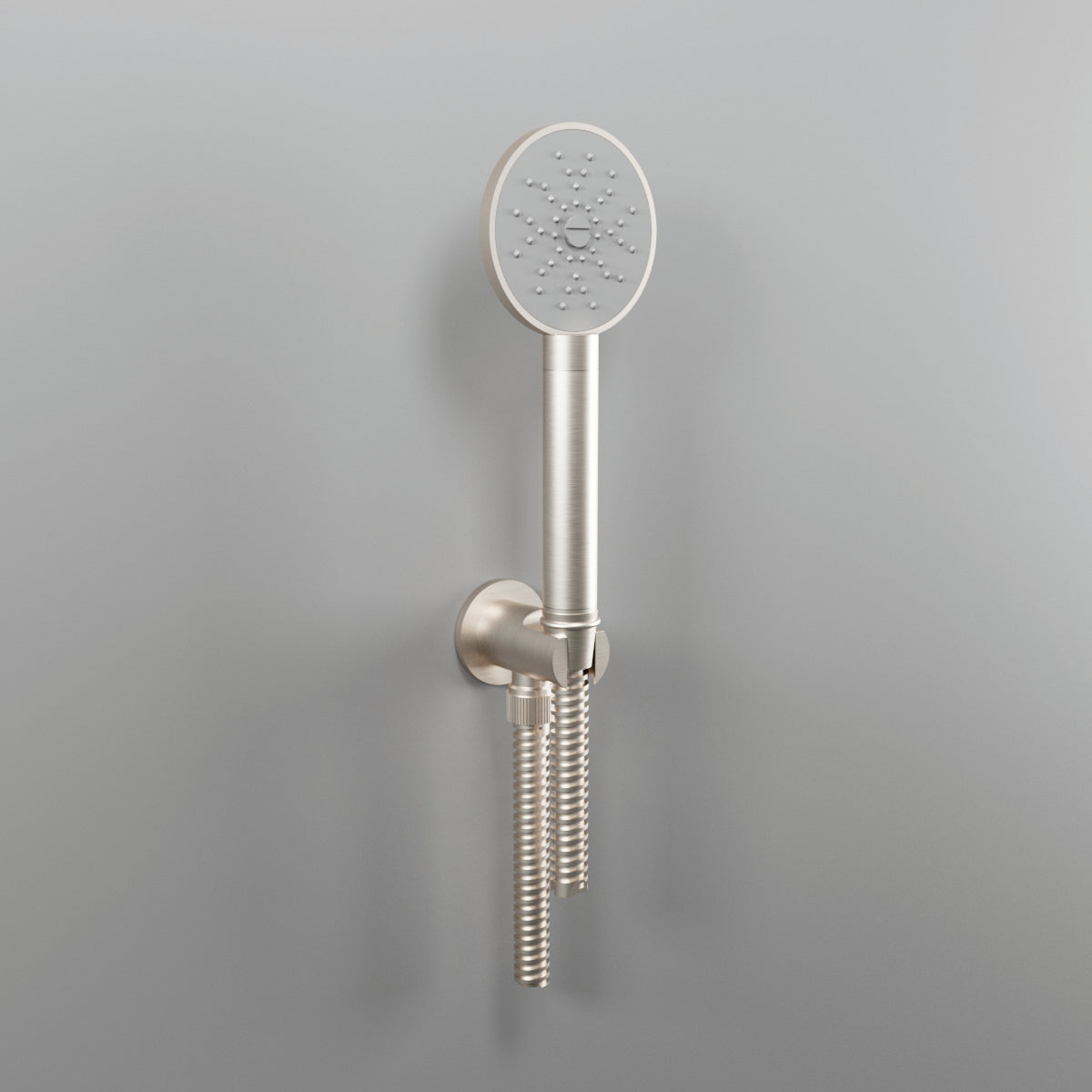Round minimalist shower set with water supply elbow, fixed bracket, ø 90 mms single function handshower and 1500 mms, 1/2” f.f. conical.